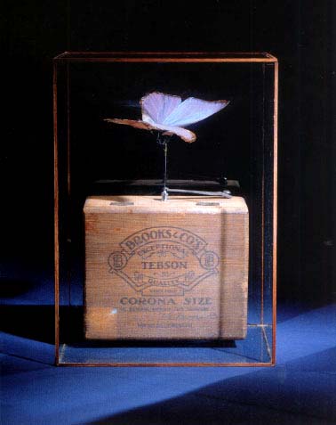 materials: wings, tissue, wire, solar mechanism, wooden box, wood and glass case